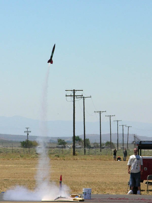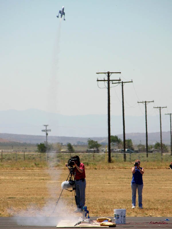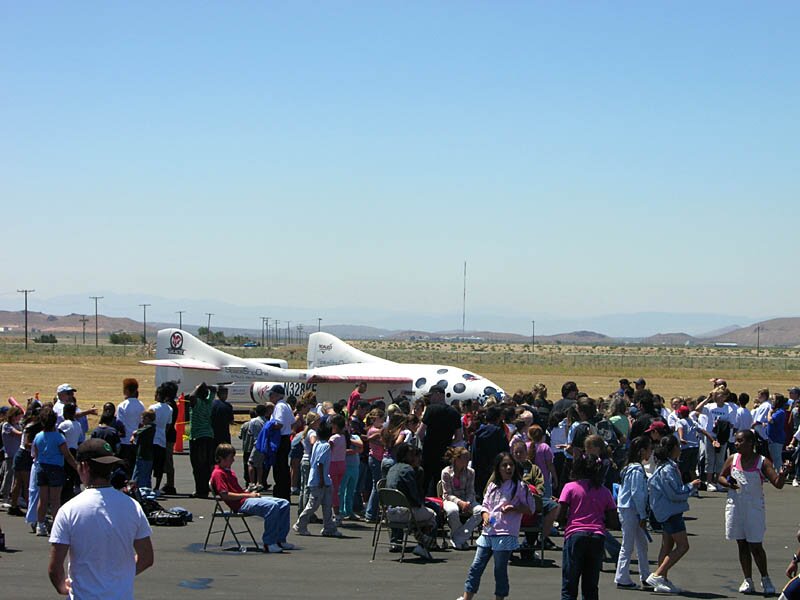 June 12, 2005 - Friday, the Mojave Spaceport hosted over 800 junior rocketeers as they competed in teams to build and launch model rockets. The event, conceived and energized by EKAD boardmember - and Fiberset President - Marie Walker, challenged local school kids to team up and build one of two designs: either one based on X-Prize contestant Canadian Arrow, or one based on Burt Rutan's SpaceShipOne. Burt even pulled the real SpaceShipOne out of the hangar and put it on display for the kids. Congrats and thanks to all the EKAD folks who worked so hard to make this event a resounding success!